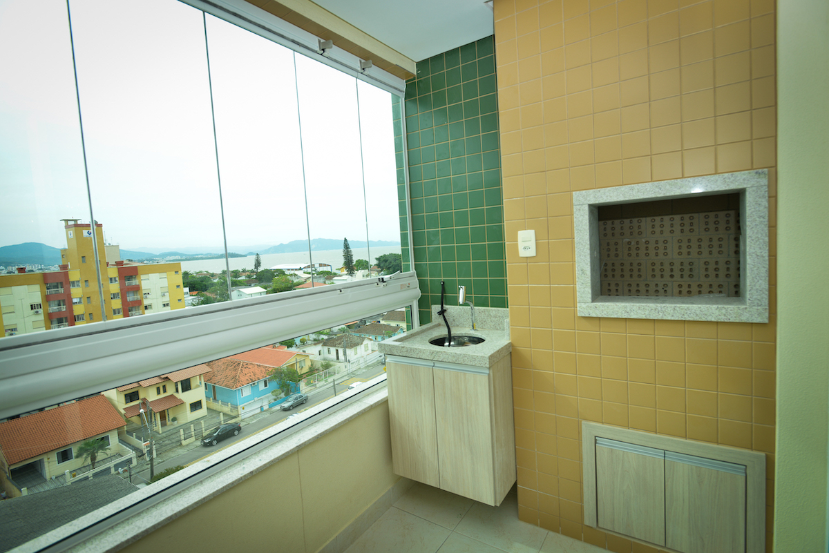 Varanda com churrasqueira e fechada com sistema de vidros Reiki;